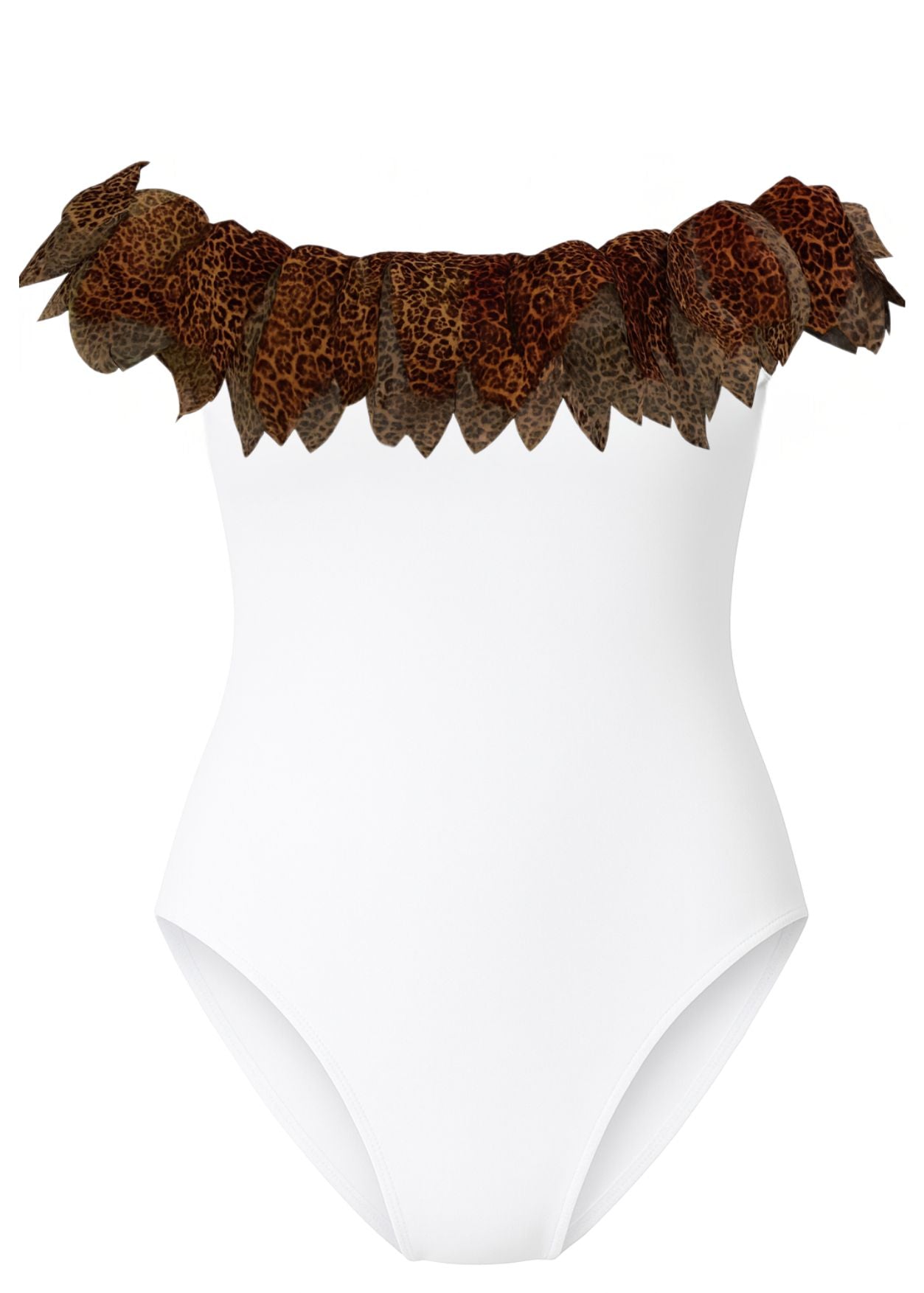 Elegant white bathing suit for women featuring cheetah petal details on the ruffle. Designed to match perfectly with the cheetah petal white swimsuit for girls, creating a stylish Mom & Me Stella Cove beachwear look. Take a look at the glamorous swimming goggles for women to complete the look.